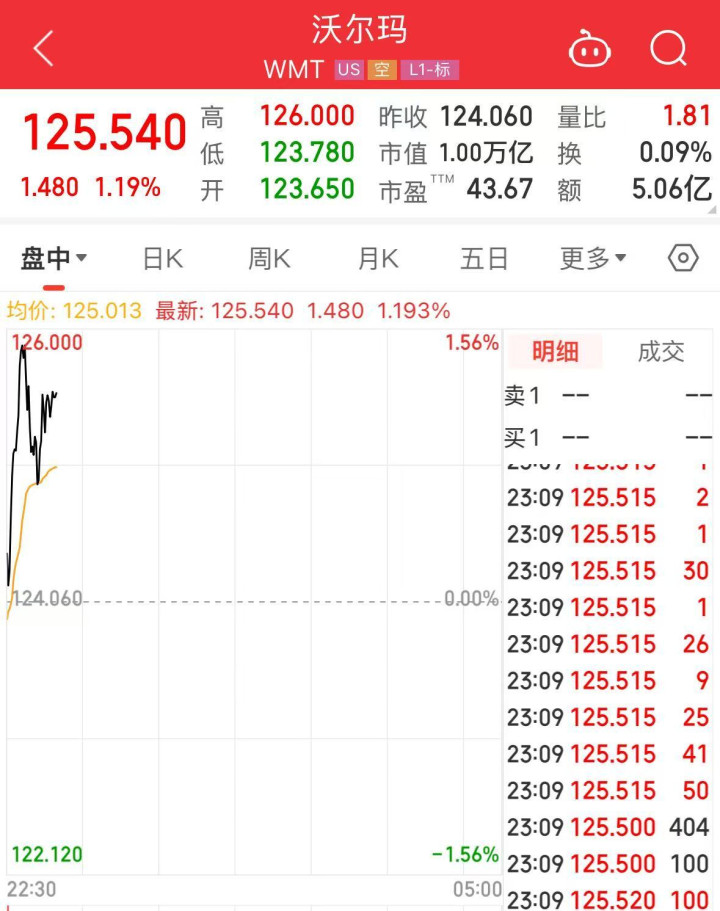 截至发稿,沃尔玛股价涨1.19%,最新报125.54美元。